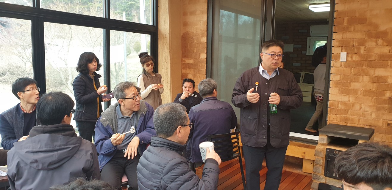 답사를 마친 후 전시관안에서 차와 커피 그리고 챙겨주신 떡을 먹으며 흙건축에 대한 질의응답 시간을 가지면서