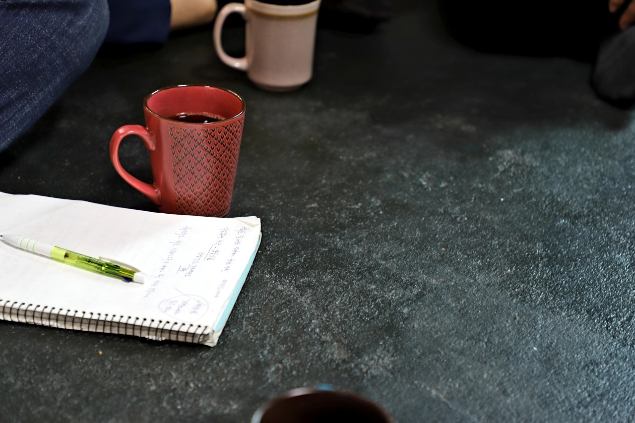 따따한 구들위에 놓여진 커피잔과 노트~