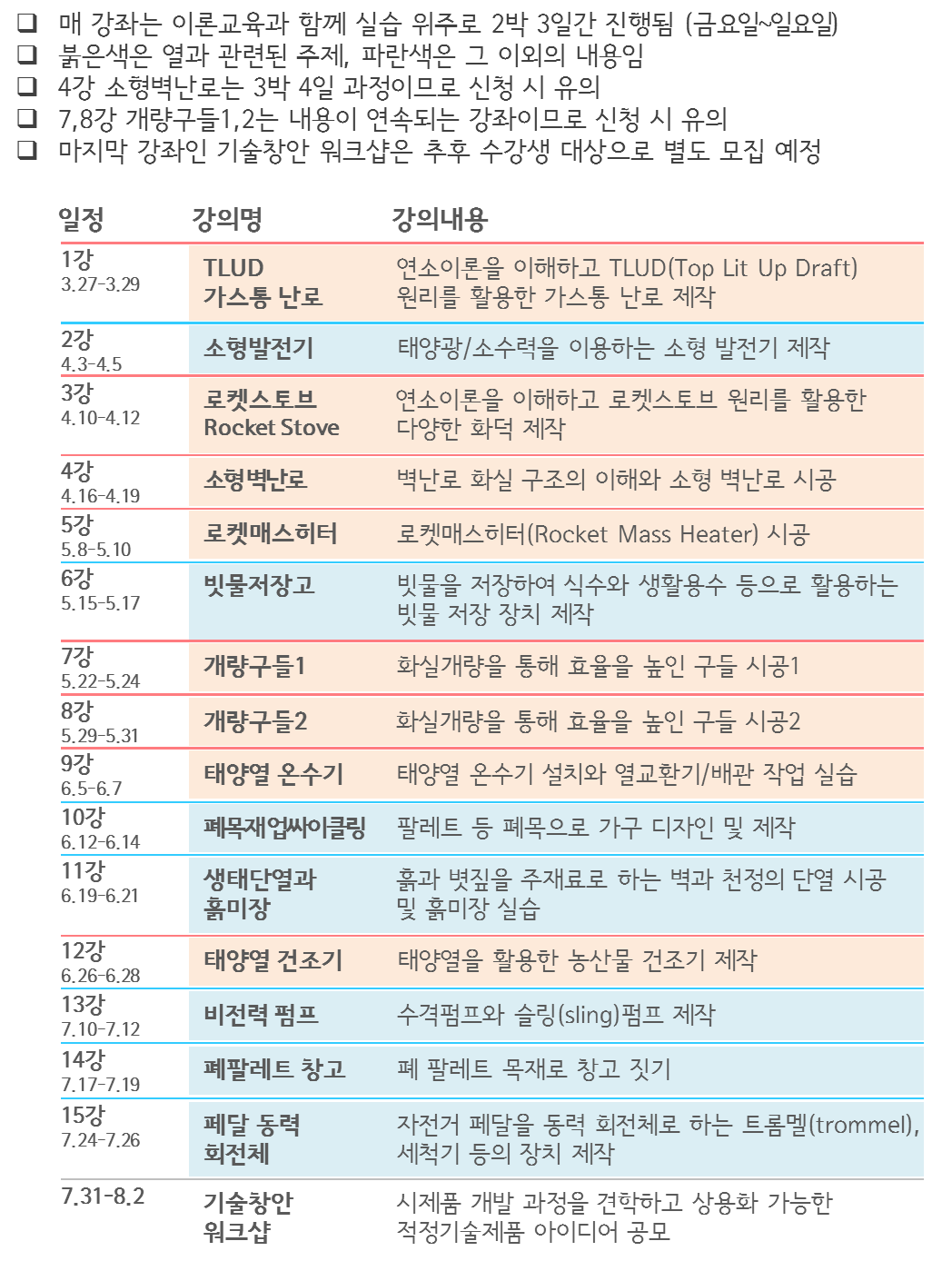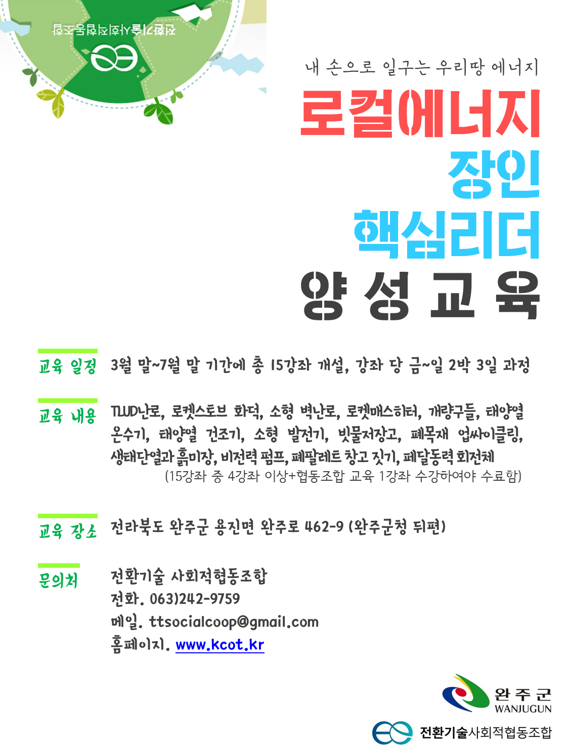 안녕하세요, 전환기술 사회적협동조합입니다. 올 해로 두 번째를 맞는 로컬에너지 교육에 관심 가져 주셔서 감사합니다. 작년과 비교하여 다양한 주제들로 구성하였습니다. 난방에 관한 내용은 물론, 에너지와 관련하여 생활 속에서 활용할 수 있는 여러 기술들에 대해 기초 원리와 제작/시공 실습 교육이 진행될 예정입니다. 본 교육을 통해 각자의 지역 내에서 로컬에너지 활동을 이어 나가시길 희망합니다. **신청방법** 1) goo.gl/GtHd1F 에서 신청 2) 홈페이지 http://www.kcot.kr 에서 자세한 사항을 확인하세요 **문의** 전화_063-242-9759 이메일_ttsocialcoop@gmail.com